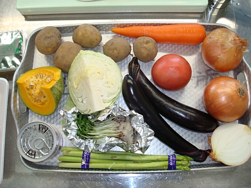 後者は、玉ねぎと肉を炒め、じゃがいもを加えた後に、夏野菜はそれぞれに油をひいたフライパンで両面を焼き、それを加えてぐつぐつ・・