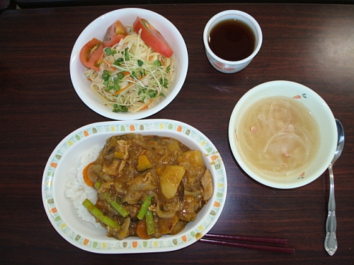 添えは、冷製コンソメスープとスパゲティサラダ。これまた、パスタの量が多くて・・とにかく300円の満腹カレー定食。