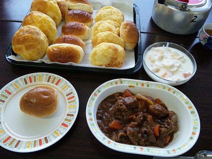 肉は大きな塊がごろごろ。パンもロールパン、チーズパン、メロンパン・・、シロヤという老舗のパン屋さんの品、一人平均4個。とても贅沢な昼食のひとときでした。