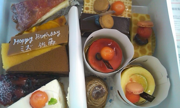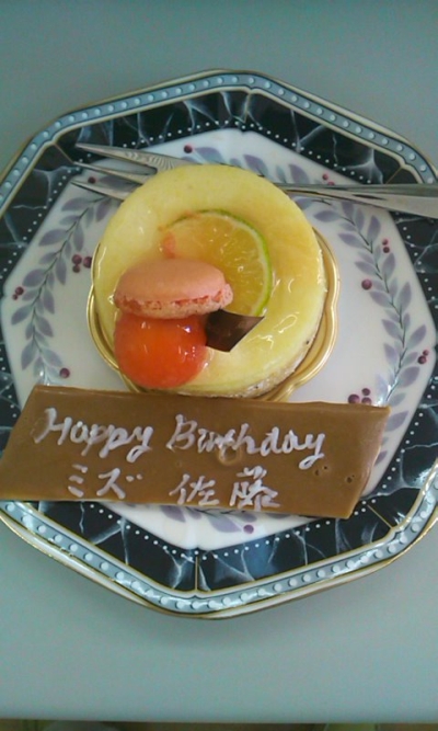 「子どもだったらホールケーキがいいと思ったけど、大人は食べやすいケーキのほうがいいと思って・・」、箱いっぱいのショートケーキ。メッセージポードには、「Happy Birthday ミズ 佐藤」、流石に英語の堪能なSさんです。
