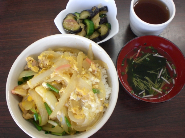 今回のメニューは、めんつゆでつくる親子どんぶり、夏野菜の浅漬け、お吸い物(インスタント)でした。