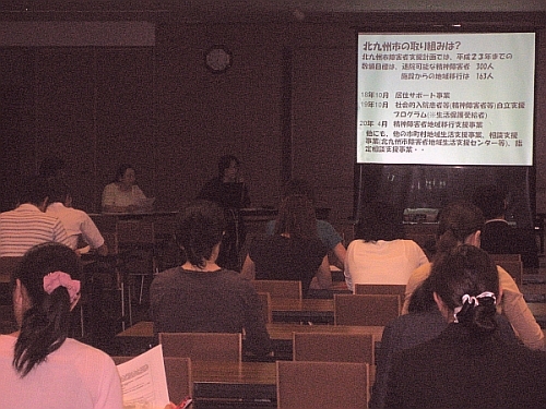 特に、今年度から各区役所の保護課に、医療・介護扶助適正化係長が新設され、19年10月より行われてきた、「精神障害による入院患者の社会復帰事業」(自立支援プログラム)が体制的に強化されたこととあわせ、これまでの地域移行ワーキンググループでの取り組みについてメンバーから、そして関連した機関からの報告をしていただく中で、「望まれる関係機関の連携体制について」検討したい、との趣旨で開催したものです。
