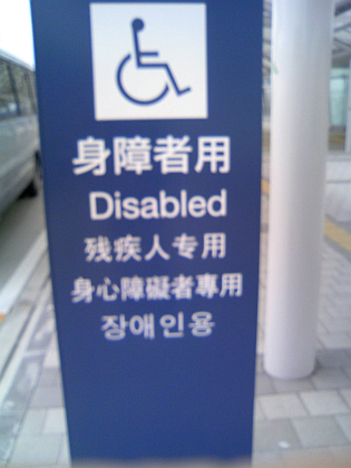 静岡空港でみかけた、障害者の表示。車椅子マークはある意味、象徴的なものですが数ヶ国語の表示を比較してみて複雑な思いでみつめてしまいました・・