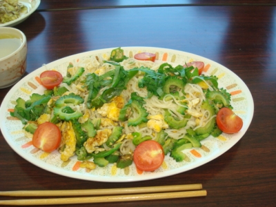 ゴーヤとオクラ、ピーマンの緑に、卵の黄色、赤いミニトマト・・、添えには大葉とみょうが・・彩りもきれいで食欲もそそられる夏バージョンでした。皆さんの食卓にもいかがですか?