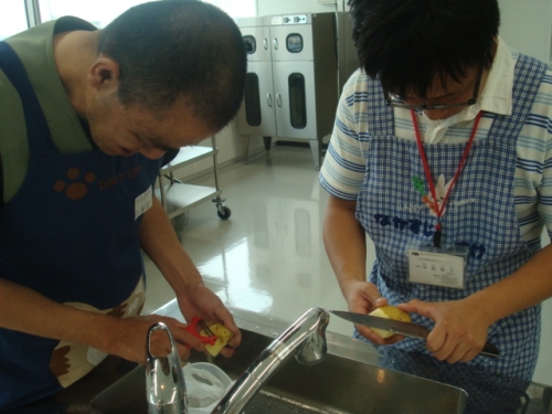 もう一人は、今精神科病院に入院中で、親元から離れてのアパートでの一人暮らしに取り組もうとしている男性。今回は、マンツーマンでのシフト。じゃがいもの皮むきに格闘しつつ、ひとつひとつを丁寧に切り、ニンジンを乱切りし、肉はヘルシーな鶏肉。玉ねぎを炒める際には涙と格闘しつつ・・。