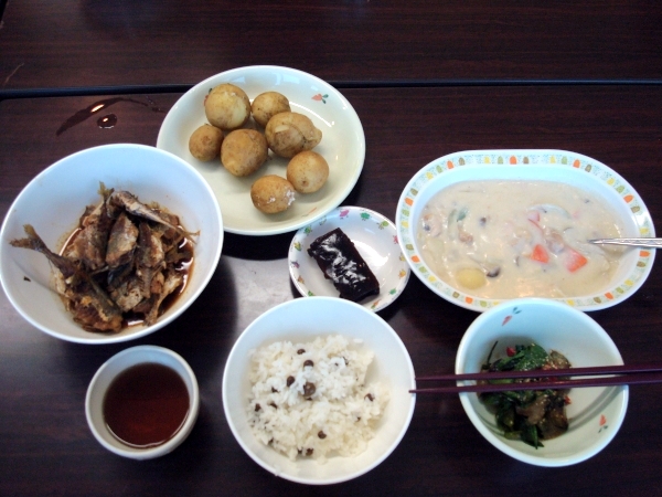 でも、いざ、ふたを開けてみると、門司港の岸壁で釣り上げた自家製のアジの南蛮漬けにこれまたお手製のプルプルの水ようかんをいただき、朝掘りのじゃがいもを蒸して一品、そして庭の山芋のむかごをいれてむかごご飯、加えてお土産のバウムクーヘン・・と贅沢な秋の季節の食卓でした。