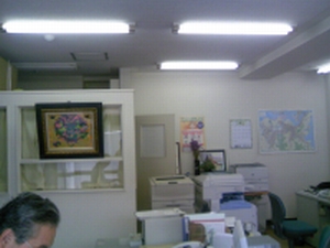 入って、正面左手の壁にあり、部屋全体がちょっと明るくなった感じです。額のあるなしで絵の印象も随分変わります。この絵は、昨年、北九州市障害者地域生活支援センターを事務局として協同作成した、「居住サポート事業の運営実施マニュアル」へ挿入されている作品です。多くの方へご覧いただければ幸いです。