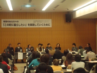 厚生労働省より清水専門官の「地域生活支援の取り組みについて」と題しての基調講演に始まり、センターよりのこの一年間の事業報告、そして現場の関係者を交えてのシンポジウム・・とちょっと欲張ったメニュー構成でした。シンポジウムの冒頭は、新しい生活を始められた4名の当事者の方々からのビデオメッセージ。そこにあふれている笑顔が全ての象徴だったと思っています。23年ぶりに精神科病院を退院して一人暮らしを始められ、「一人暮らしは楽しいですよ。皆さん、どうか挑戦してください。」とエールを送ってくださったご本人は会場におられ、ちょっとはにかんでみつめておられるその姿は感動的でもありました。サポーターのお一人は、車椅子の女性の転居の際に手伝っていただき、「そのときには正直不安も感じたけど画面の中の彼女は別人みたいに輝いていて、ちょっとした支援で生活は拡がるんだなぁ、たくましく変わっていくんだなあ・・とその日々に思わず目頭が熱くなりました。」、と語っておられました。「当事者の生の声が聞けてよかった」、「施設の中との笑顔の違いを痛感させられた」・・と素直な感想もたくさんいただきました。